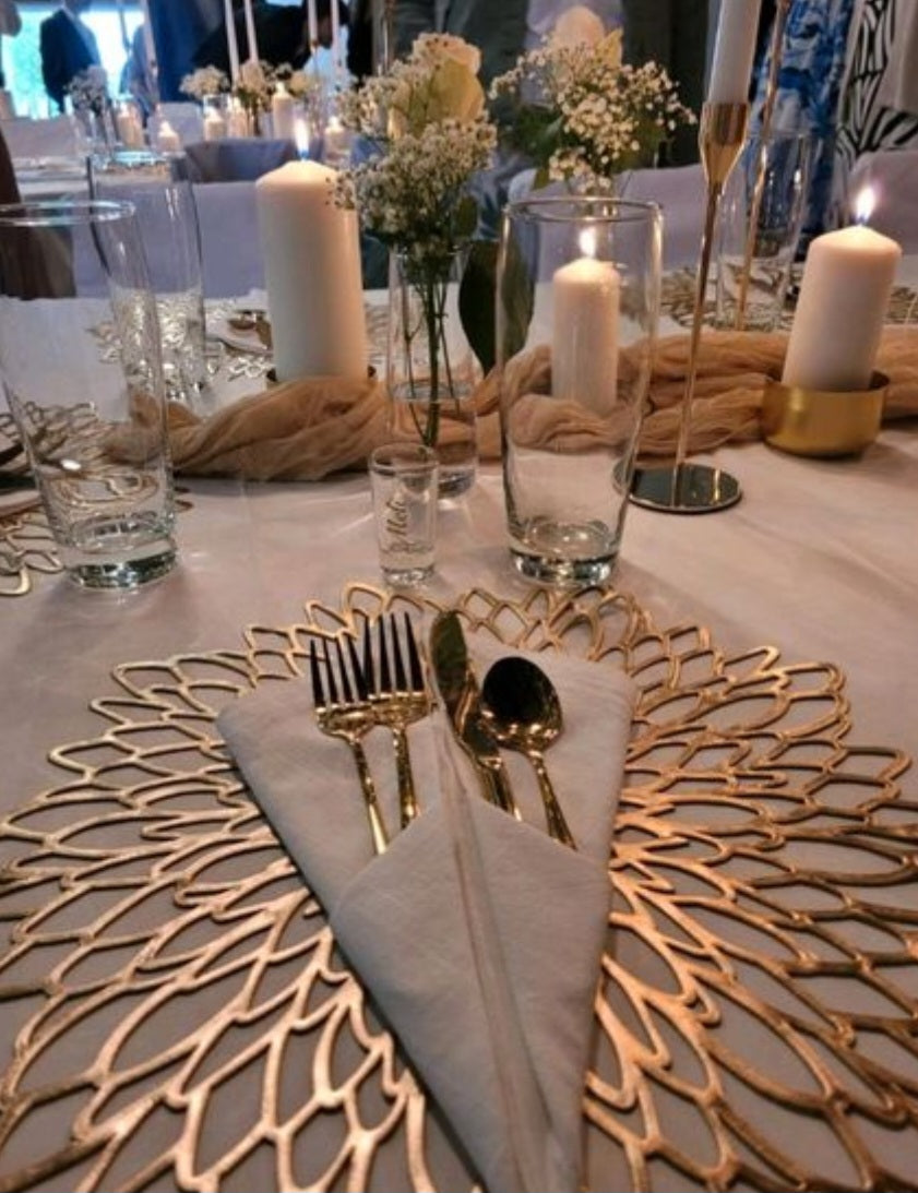 Verleihe deiner Hochzeit oder deinem Event mit goldenem Besteck einen Hauch von Eleganz. Perfekt für kleinere Feiern, bietet unser stilvolles Besteck eine unvergessliche Atmosphäre. Ideal für intime Hochzeiten und besondere Anlässe.